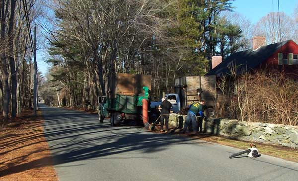 Clean up consists of raking leaves and hand picking leaves from shrubs. We use rakes, and an assortment of different size leaf power blowers. There has been much discussion and some legislation about the use of power blowers lately. Power blowers reduce the amount of time a crew will take to complete a clean up work task. Time will determine the cost of the work task at hand. If you wish to request a Quiet Clean-up, we will be happy to accommodate. Debris is collected, corralled and put on a tarp. Debris can be moved to a compost area on your property, loaded on a truck with a truck loader which is a big vacuum, or wet debris can be loaded with a small front end loader.