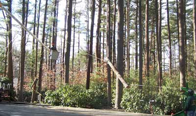 If you search the I.S.A. ( International Arborist Association ) climbers website back to the early 1996 you will find many posts from the " Mockingbird" discussing climbing and rigging, including SLA ( Single Line Assent ion). Basically without getting too deep we use rope to lower parts of the tree into a desired drop zone. We can use one rope if the drop zone is open and not to target rich, buildings, pools, shrubs. We may use two ropes, a tip - load line and a but hinge line to remove a large branch, leader or an entire tree. We may put a third line on it to make sure it falls in the right direction - directional line. We may use a re - direct line from another point in the tree we are removing or it may be in a separate tree to make the piece be lowered into a target free drop zone. There are so many combinations of rigging techniques it would be impossible to list them in this page. We can make smaller tree removals, large leaders, branches take place going from standing to the chipper with out touching the ground until the piece is out of a target rich drop zone - see slide show below. We could talk about "Zip lines, Trolley Lines". That would take pages. These are complicated rigging techniques. Knowing which scenario to use them could save you the price of a crane. The simple rigging listed above most Arboricultural contractors SHOULD have that ability. If the contractor can not explain " Zip Lines or Trolley lines" they have very limited experience with rigging.