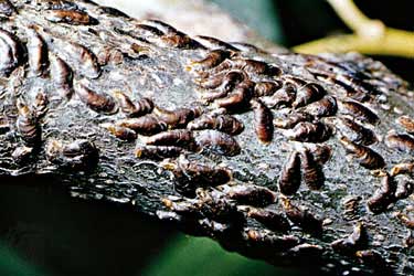 Our largest scale insect, this species reaches l/2 inch in length. Color ranges from dark brown to pink-orange and older scales are covered with a white waxy powder. Large amounts of a sticky waste product called honeydew are secreted by the scales. Wasps and ants are attracted to the honeydew and black fungi called sooty molds grow on surfaces where honeydew collects. There is one generation per year with crawlers active from September l-20, much later than most other species.