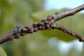 These scales are shaped like the shell of an oyster. They are chestnut to dark brown, sometimes with lighter transverse bands. Twigs are often completely encrusted with scales. This is a common and destructive pest of over l20 different species of fruit trees, shade trees, and woody ornamental shrubs. Hosts include apple, lilac, dogwood, boxwood, birch, elm, sycamore, viburnum and many others. There are two generations per year with crawlers active May l-20 and July l5- 25.